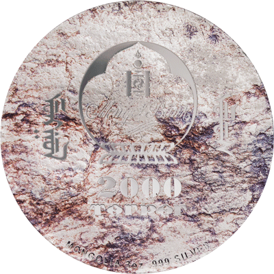 Die Vorderseite zeigt das Wappen der mongolischen Nationalbank, darunter in kyrillischer Schrift 2000 Togrog, im Abschnitt in lateinischer Schrift MONGOLIA 3 oz .999 SILVER. Die Rückseite präsentiert das fossilierte Skelett eines Protoceratops; Darunter in Kursivschrift Protoceratops andrewsi, in Druckschrift Late Cretaceous, Mongolia.
