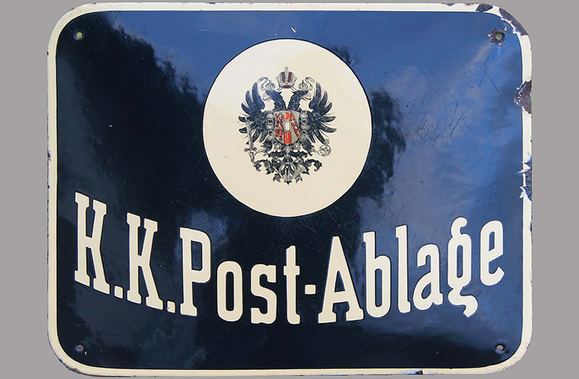 Das Bild zeigt ein Postablage-Schild mit Inschrift „K.K. Post-Ablage“ und österreichischem Doppeladler. Solche Schilder heute ausfindig zu machen, ist alles andere als einfach; dieses Exemplar stammt aus der Sammlung des Österreichers Johannes Gschiel.