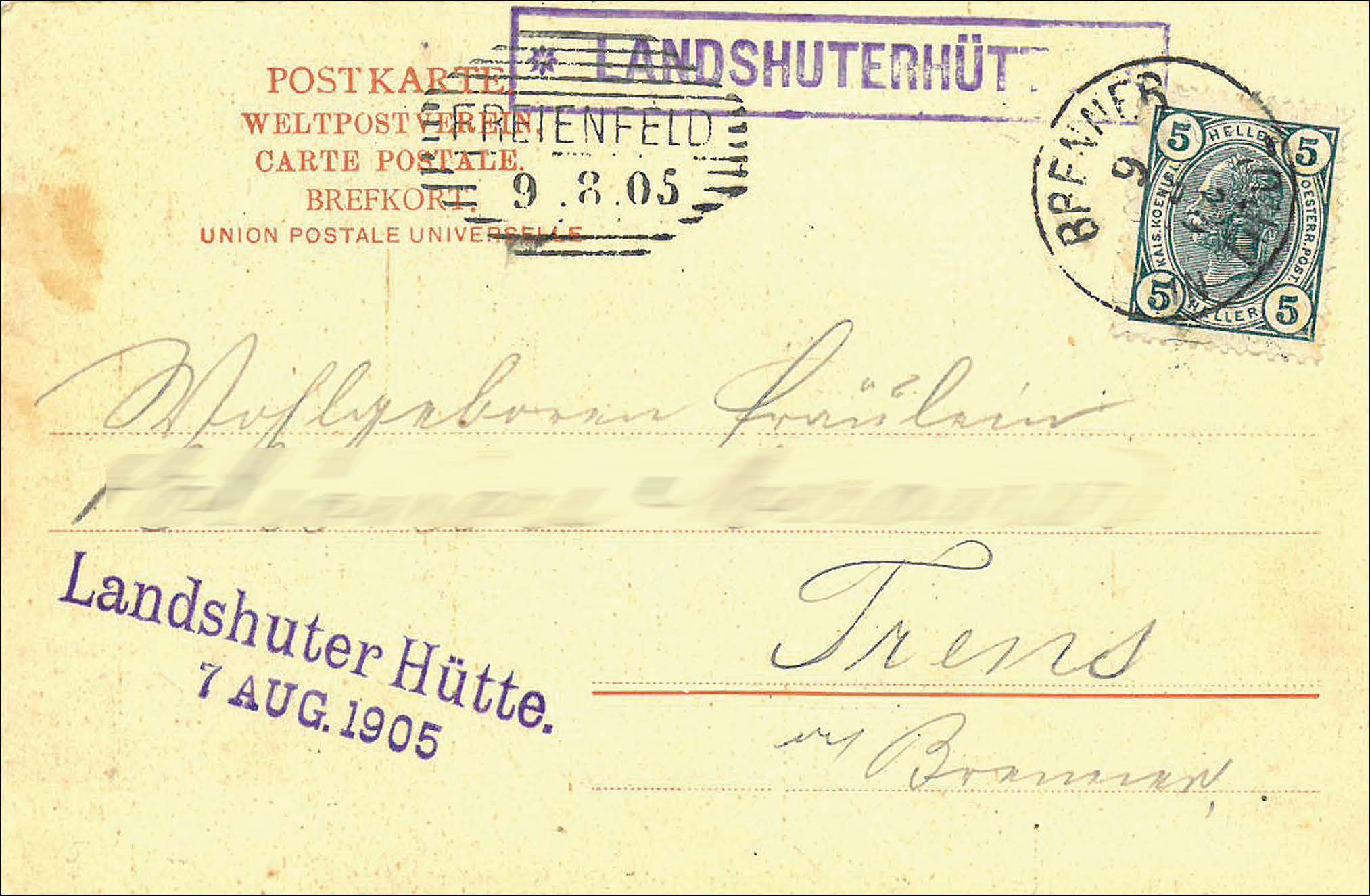 Die Postkarte lief von der Landshuter Hütte nach Freienfeld, italinisch Campo di Trens, nahe Sterzing. Sie trägt den Hüttenstempel „Landshuter Hütte. 7 AUG. 1905“ sowie den Postablagestempel „LANDSHUTERHÜTTE“. Beide sind von der Frankatur abgesetzt; entwertet wurde die Marke mit dem Poststempel von Brenner in Tirol am 9. August 1905. Ab und zu wurden auch Postablagestempel ersetzt; der hier gezeigte ist deutlich größer als auf späteren Karten.