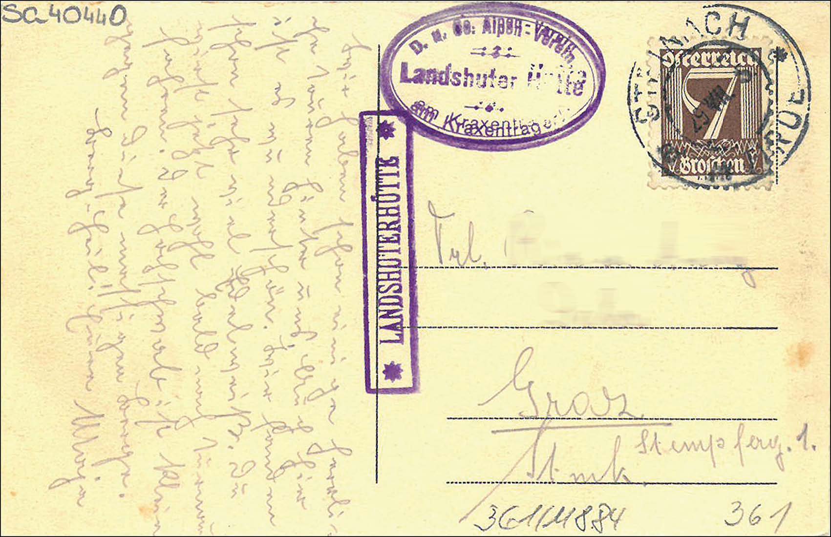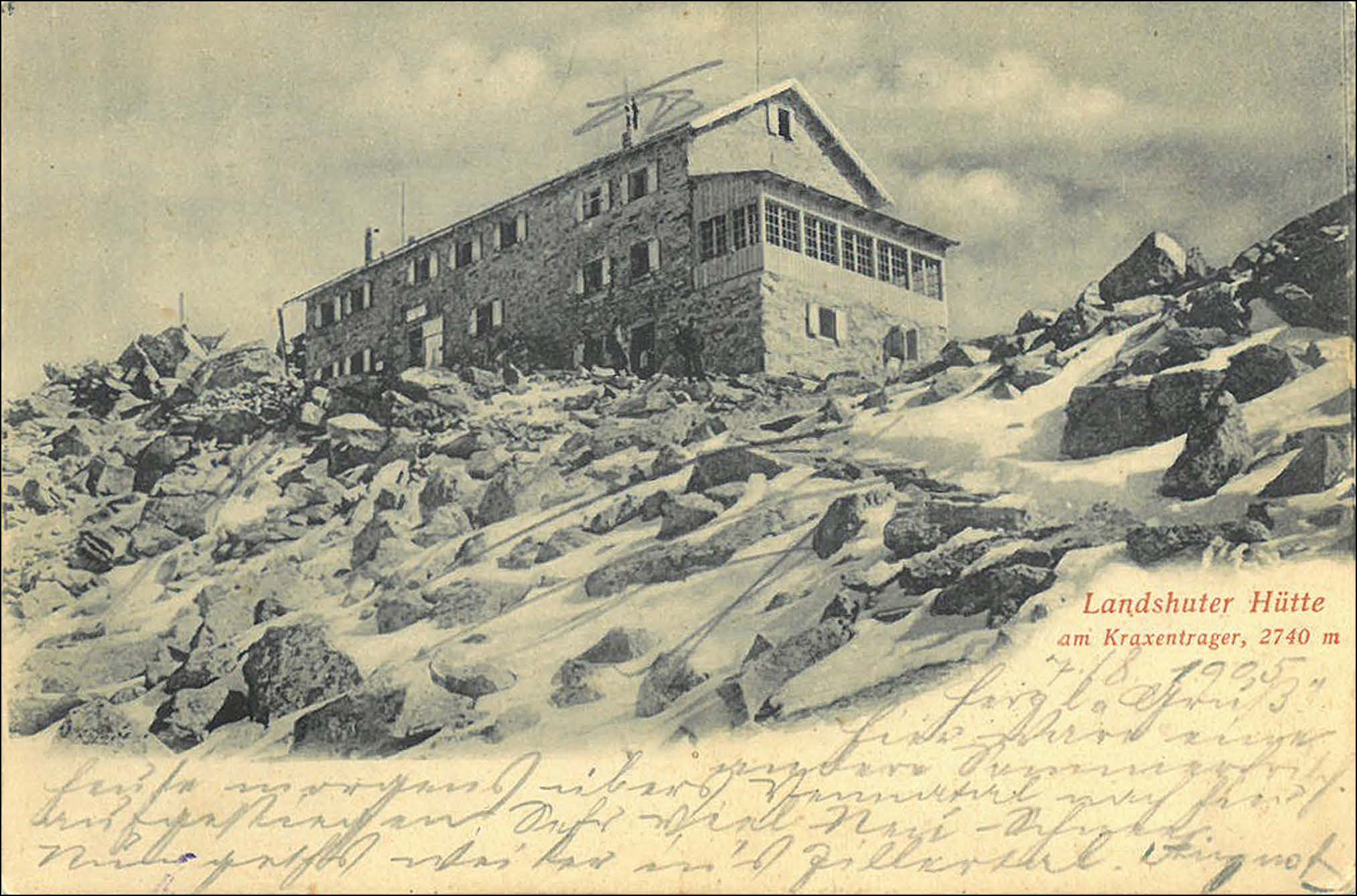 Die hier gezeigte Postkarte lief von der Landshuter Hütte nach Graz in der Steiermark. Sie trägt den Hüttenstempel „Landshuter Hütte am Kraxentrager“ sowie den Postablagestempel „LANDSHUTERHÜTTE“; entwertet wurde die Marke mit dem Poststempel von Steinach am Brenner vom 29. Juli 1925. In diesem Jahr war der österreichische Teil der Hütte wiedereröffnet worden.