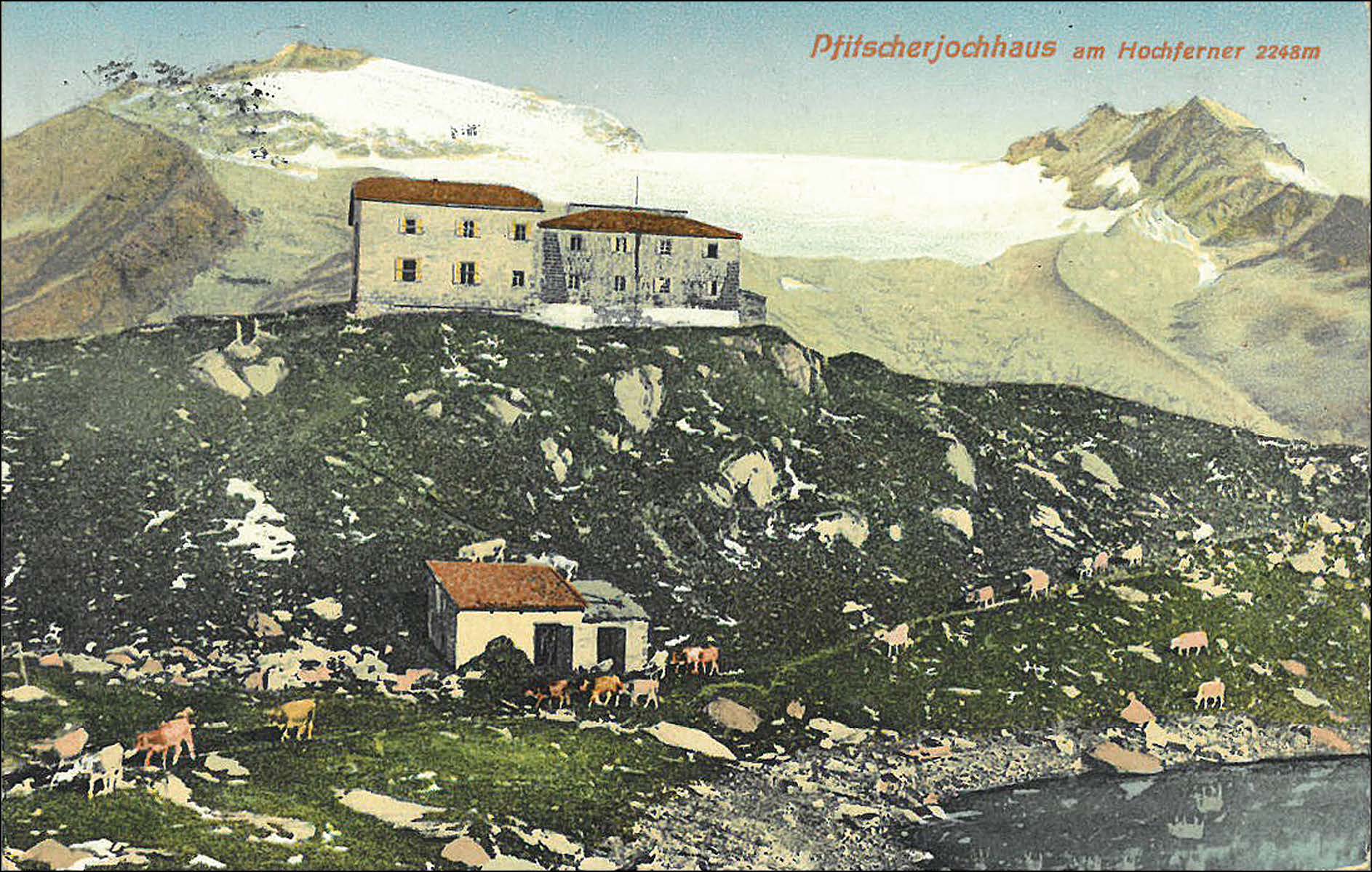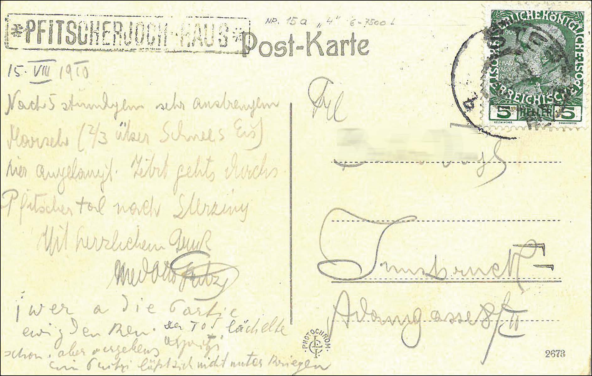 Die Ansichtskarteging vom Pfitscher-Joch-Haus nach Innsbruck mit rückseitigem, merklich von der Frankatur abgesetztem Postablagestempel und Poststempel von Sterzing aus dem Jahr 1910.