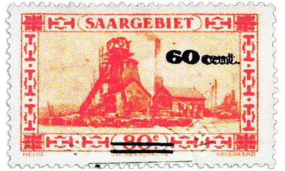 Am 28. März 1930 erschien im Saargebiet die Aufdruckmarke MiNr. 142 zu 60 Centimes. Hierzu war die Urmarke MiNr. 116 aus der fünften Landschaftsbilder-Ausgabe zu 80 Centimes mit der neuen Wertangabe und zwei Balken überdruckt worden.