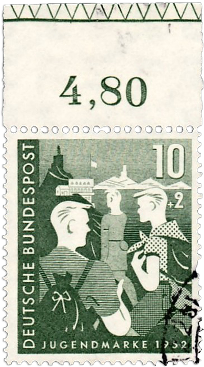 erlauben Sie, dass ich Sie mit einer Bund-Besonderheit konfrontiere, die meines Erachtens auch katalogisiert werden sollte. Die Besonderheit, die offensichtlich nur bei MiNr. 153, nicht jedoch bei MiNr. 154 der Ausgabe „Zweiter Bundesjugendplan“ vorkommt, ist relativ selten, wird aber hin und wieder angeboten. Gerne von Ihnen hörend, verbleibe ich