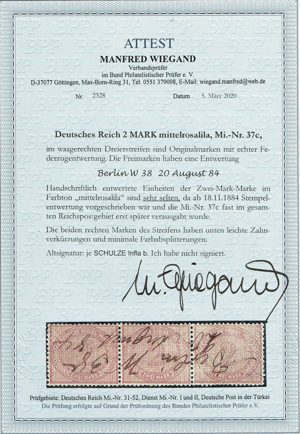 Anders sieht es allerdings aus, wenn wir ins Jahr 1884 gehen, einen waagerechten Dreierstreifen der MICHEL-Nummer 37 c des Deutschen Reiches nehmen und diesen unter Aufbietung unserer Sonntagsschrift mit Angabe von Postamt „Berlin W 38“ und Datum „20. August 84“ federzugentwerten.