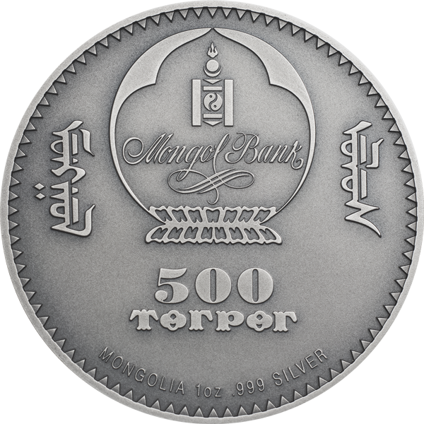 Die Wertseite zeigt das Wappen der mongolischen Nationalbank, darunter in kyrillischer Schrift 500 Togrog, im Abschnitt in lateinischer Schrift MONGOLIA 1 oz .999 SILVER. Die Kleingoldmünze zeigt dieselbe Wertseite mit angepasster Umschrift, also 1000 Togrog und MONGOLIA 0.5 g .9999 GOLD; die Bildseite präsentiert dasselbe Fossil, darunter Diplocaulus, darüber EVOLUTION 2020, vor der Jahreszahl kleiner Ammonit.