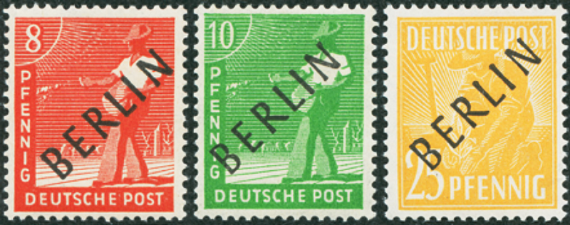 Beide Sätze wurden aus Urmarken der Arbeiterserie der Gemeinschaftsausgaben, der sogenannten II. Kontrollratsausgabe, gewonnen. Überdruckt wurden verschiedene, bereits vorhandene Auflagen der Urmarken; für einen Teil der Berliner Aufdruckmarken wurden die Urmarken aber auch neu hergestellt und anschließend überdruckt. Die exakten Farbtöne dieser Neuauflagen gibt es nicht bei den ursprünglichen Auflagen. Diese Tatsache hilft uns beim Beurteilen, ob eine solche Marke echt sein kann. Die Pfennigwerte wurden in 100er Bogen gedruckt, die Markwerte in 50er Bogen. Hierfür gab es eine andere Aufdruckplatte, jedoch aus gleichen Typen mit gleichen Maßen.