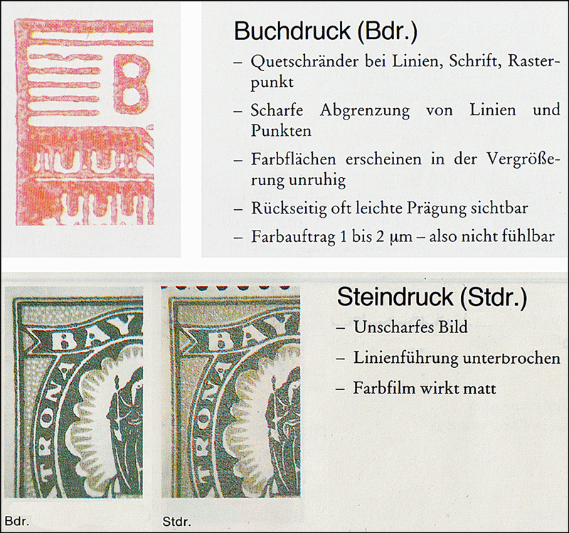 Beim Buchdruck sind an den Kanten der bedruckten Stellen „Drucknähte“ zu sehen, auch „Quetschränder“ genannt. Das sind scharfe dunklere Linien, die wie eine Einfassung die bedruckten Bereiche umgeben. Das Druckbild bei Steindruckmarken wirkt indes matt, weich und an den Konturen undeutlich.