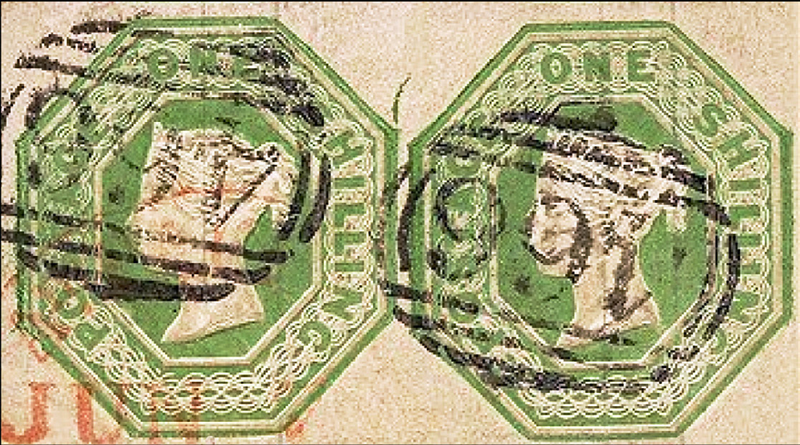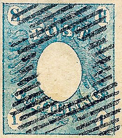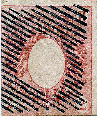 Und schließlich gibt es noch die Fälschung vom Typ III. Diese wurde von François Fournier, dem berühmten Schweizer Briefmarkenfälscher, angefertigt. Nach Jean de Sperati war Fournier sicher die Nummer Zwei der Fälscherzunft. Fournier klebte einen Faden auch rückseitig auf das Papier, bei dem es sich aber wohl nicht um Seide handelte, sondern um eine Rolle Garn aus dem Nähkästchen. Zusätzlich hinterlegte er das Papier mit einer weiteren dünnen Papierschicht. Dies ist letztlich die beste Nachahmung des Dickinsonschen Sicherheitspapiers. Fourniers Fälschungen werden gerne auch von Händlern für echt gehalten, da sie zudem eine erkennbare Prägung des Mittelovals zeigen. Da Fournier die Markenzeichnung indes misslungen war, stempelte er die meisten dieser Fälschungen mit stark überdeckenden Strichstempeln, die er eigens für diese Fälschung angefertigt hatte. Die Strichanordnungen sehen den echten Stempeln indes nicht einmal entfernt ähnlich.
