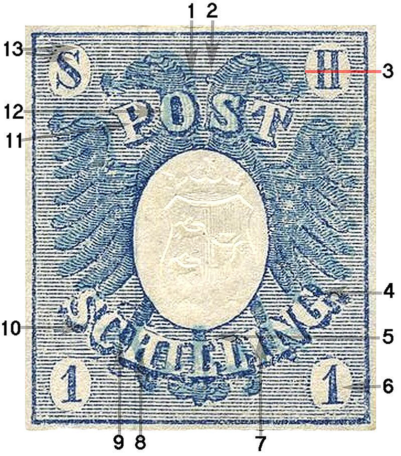 Die Pfeile Nr. 13 zeigen auf die Serifen des „S“ im Oval oben links, die bei Fälschungen abweichende Formen haben. Dieser Teil des Markenbildes wurde mechanisch vervielfältigt und sieht immer gleich aus, auch bei den Marken zu 2 Schilling.