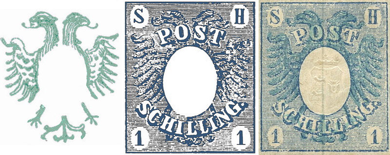 „Das Departement der Finanzen wird ermächtigt, die Anfertigung von Marken oder Postschillingen zu veranlassen, mittels deren Befestigung auf dem Briefe das Frankieren nach Maßgabe der Post-Taxe bewirkt werden kann. Diese Marken tragen das Schleswig- Holsteinische Wappen.“