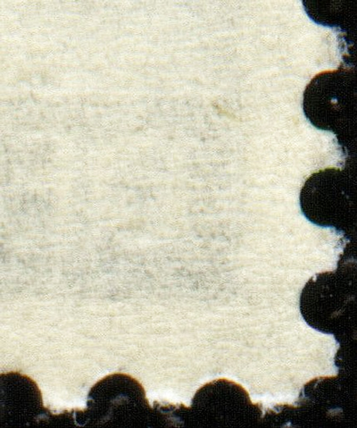 Unser Beispielbild zeigt eine verfälschte Marke. Die Zahnspitzen rechts sind bis über die Faserenden hinaus gummiert; die Gummierung liegt über den Faserenden. Eine Originalmarke wird dagegen erst gummiert, dann gezähnt und schließlich getrennt; die Fasern an den Zahnspitzen bleiben also zwangsläufig gummifrei. Auffällig ist, dass die Zahnspitzen unten keinen Gummi aufweisen und darüber hinaus ein kurzes Stück Papier gummifrei geblieben ist. Der Fälscher hat die Marke offenbar fixiert, um den falschen Gummi auftragen zu können. Die Stellen, an denen die Marke gehalten wurde, zeigen keinerlei Gummi.