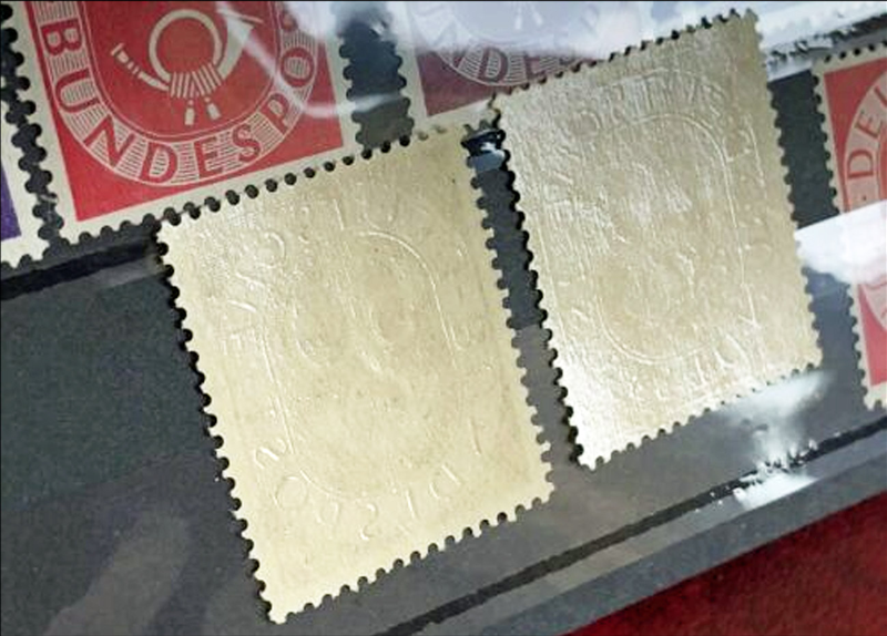 Der Buchdruck prägt sich nicht auf die Gummierung durch, die Gummierung ist unnatürlich geriffelt und schneeweiß. Auch bildseitig ist die unnatürliche Riffelung deutlich zu sehen.