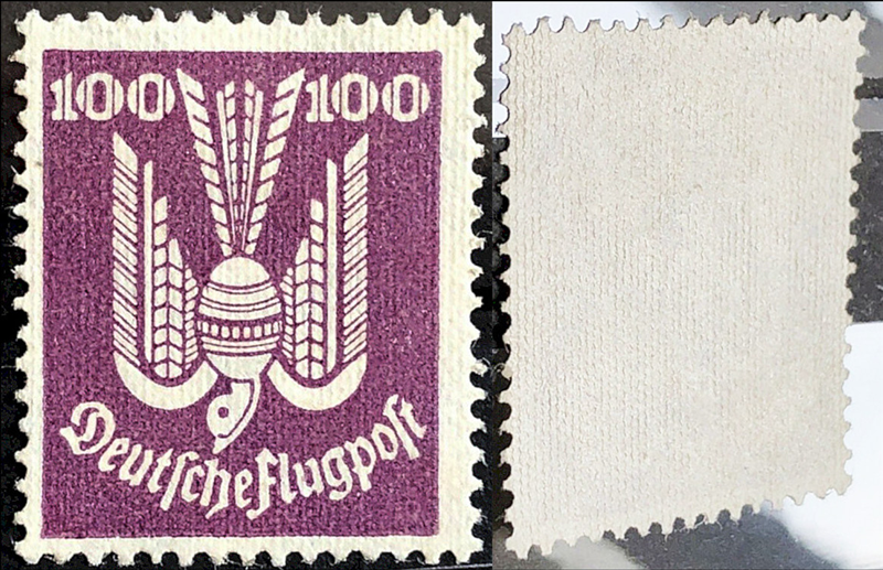 Hier ein verfälschtes Exemplar der Marke Deutsches Reich MiNr. 348, 100 Pf. Flugpost.