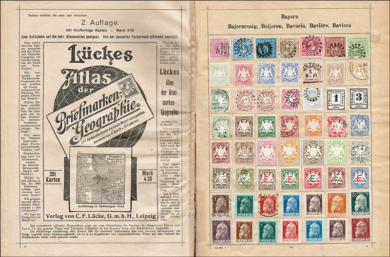 Die Abbildung zeigt ein Briefmarkenalbum um 1920 mit eingefalzten Postwertzeichen Bayerns.