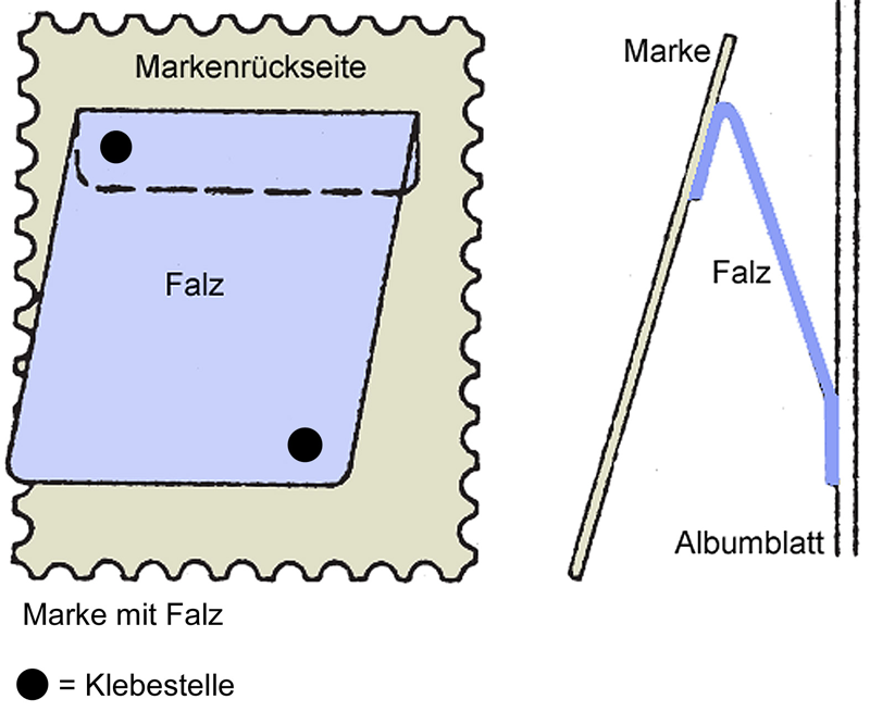 Die Schemadarstellung verdeutlicht die Anbringung des Falzes an der Marke und im Album.