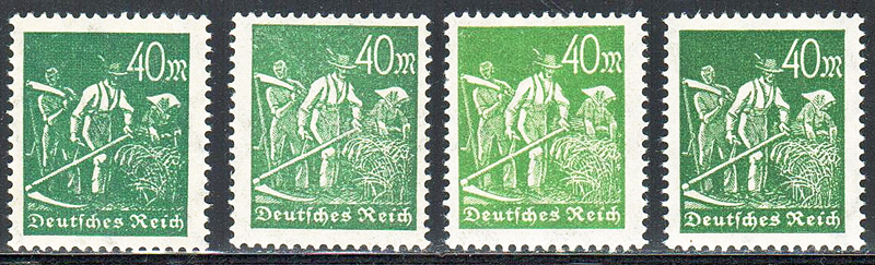 Im MICHEL-Deutschland-Spezial 2022 wurden bei der Freimarke „Arbeiter“ mit dem Nennwert 40 Mark Korrekturen bei den Farbbezeichnungen vorgenommen und als weitere Farbe die MiNr. 244 d in die Katalogisierung aufgenommen. Anlass hierfür war zum einen, dass die bisherigen Farbbezeichnungen nicht den zutreffenden Farbmustern des MICHEL-Farbenführers in der 38. Auflage entsprachen; zum anderen sollten die bislang unter der MiNr. 244 b erfassten selteneren Marken aus der sogenannten Walze 13 – das sind die Marken, die am Ober- und Unterrand 13 Walzenstriche aufweisen – gesondert katalogisiert werden.