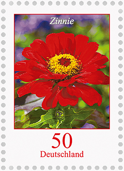 Die auf dem neuen Sonderpostwertzeichen aus der Dauerserie „Blumen“ abgebildete Zinnie (Zinnia elegans), die ursprünglich aus Mexiko stammt, ist eine auch in unserem gemäßigten Klima überaus gut und vielgestaltig gedeihende Sommerblume.
