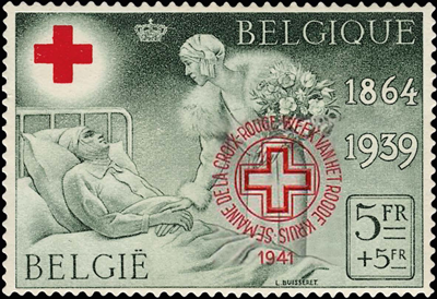 ich habe in einer Sammlung eine belgische Marke MICHEL-Nr. 504 mit folgendem roten Aufdruck gefunden: „SEMAINE DE LA CROIX-ROUGE WEEK VAN HET ROODE KRUIS 1941“. Die Marke ist rückseitig nummeriert „9841“.