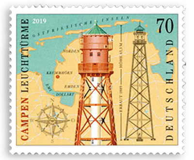 Einsam erhebt er sich hinter dem sicheren Emsdeich in den weiten ostfriesischen Himmel und gehört doch zu den architektonischen Publikumsmagneten an der deutschen Nordseeküste: der Leuchtturm Campen, Vorposten auf dem Weg in den Emder Hafen.