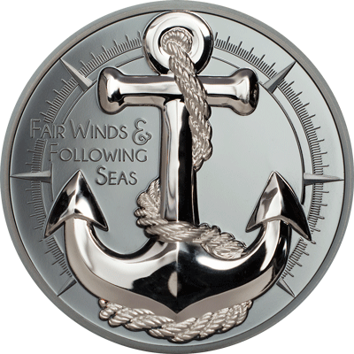 Der Anker steht auf der Prägung „Fair Winds“ von CIT Coin Invest AG im Mittelpunkt. Er hebt sich im Hochrelief von dem sonst relativ flachen Untergrund ab. Die Felder der Münze wurden im Black Proof Verfahren, der Anker und das ihn umwindende Seil im Polierte Platte Verfahren hergestellt. So wird der optische Gegensatz zwischen dem hochglänzenden Anker und dem schwarzgrauen Hintergrund noch augenfälliger.